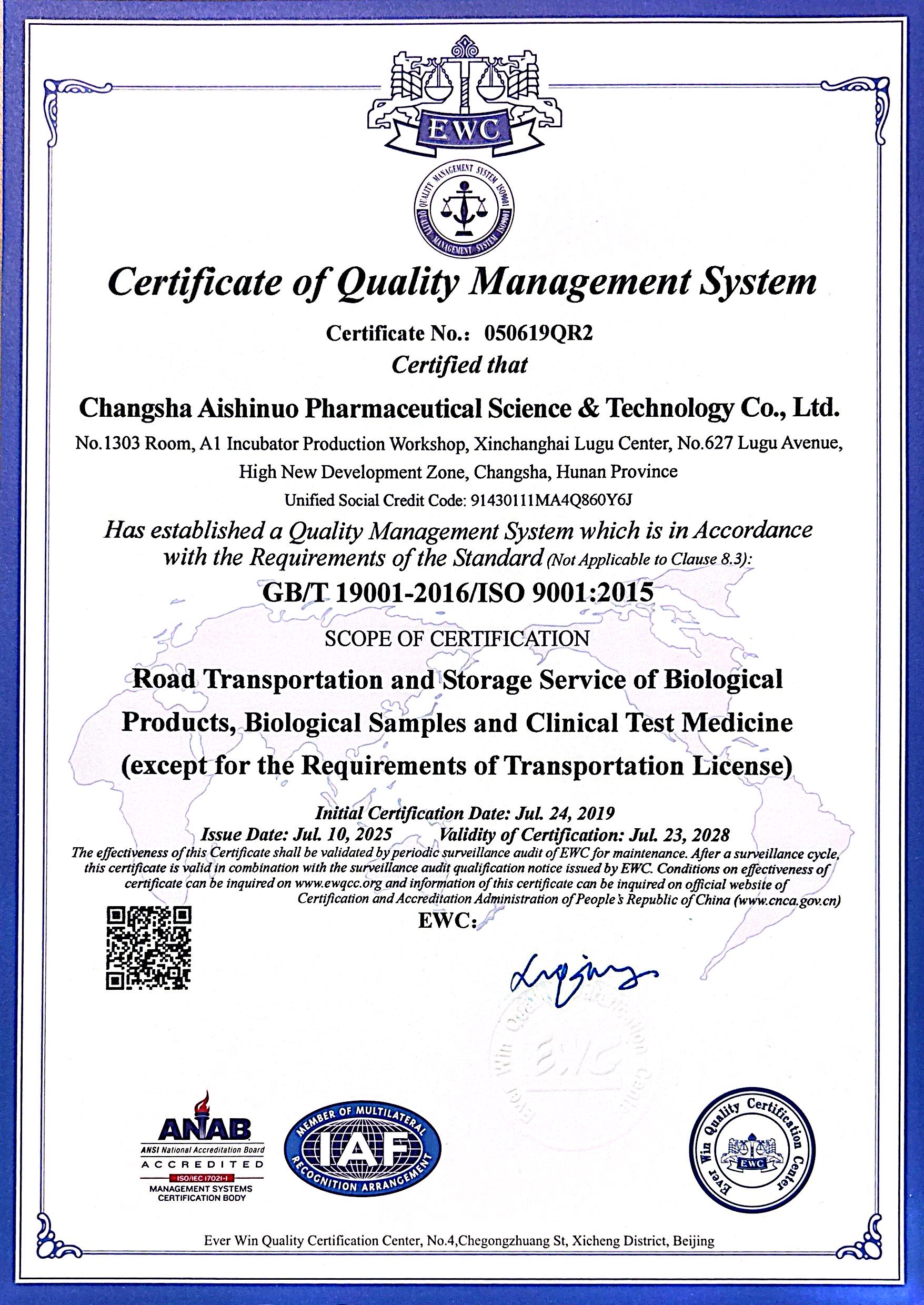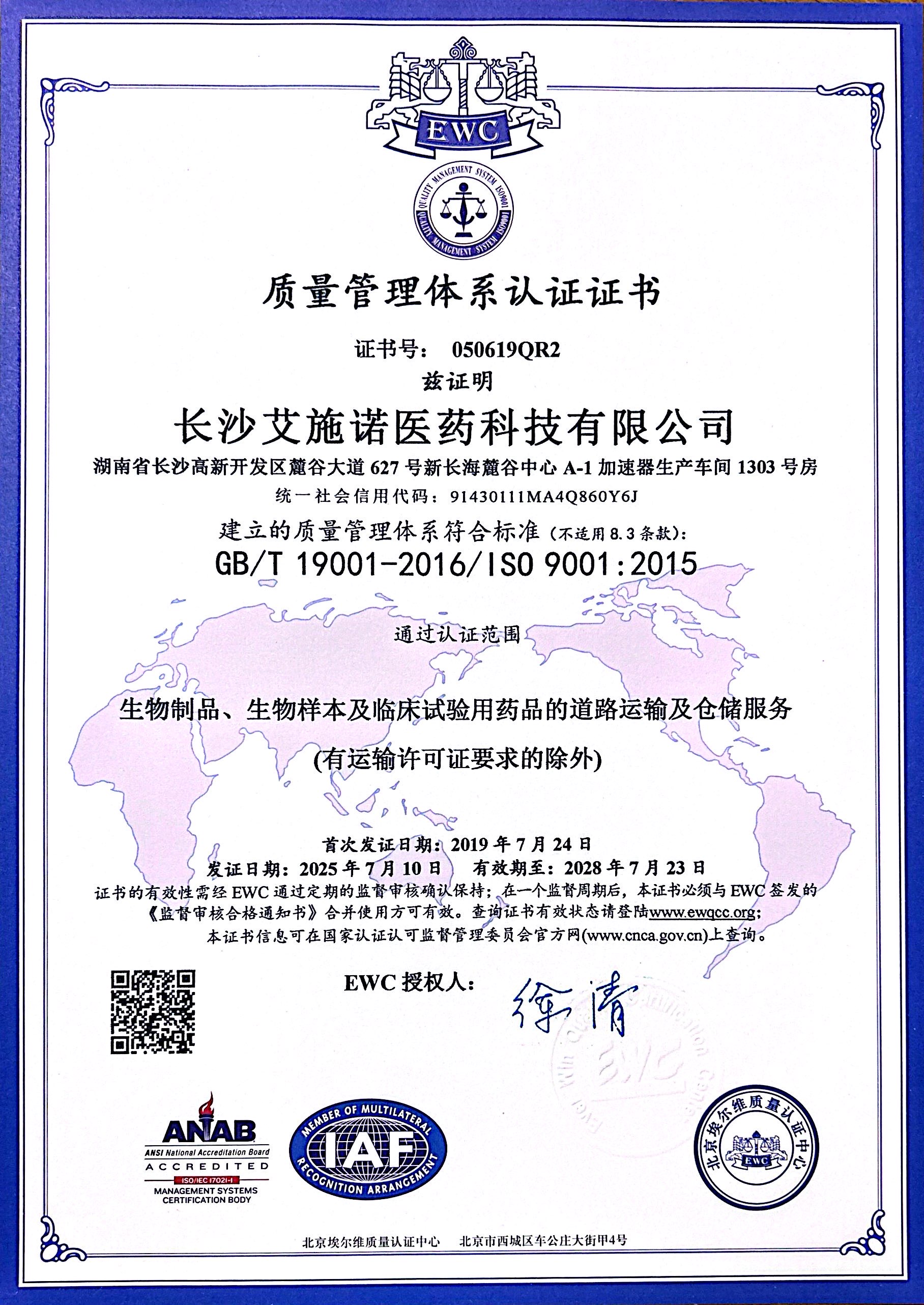 艾施诺取得ISO9001:2015质量管理体系认证证书
